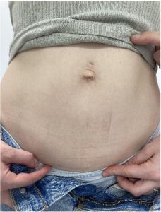 20代後半の女性 臍ピアスの瘢痕あり4kg近い男児を帝王切開にて出産。その後ポッコリおなかが気になっていました。臍ヘルニアの合併症を認めます。国際分類[European Hernia Society (EHS)分類 T1D3H1(白線120mm 臍15*15mm)